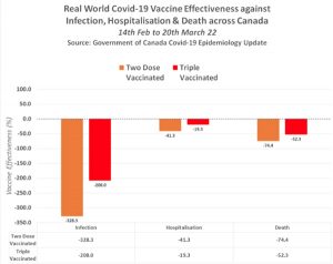 According to the Government of Canada’s Covid-19 Epidemiology Update, from February 14 to March 20th, vaccine effectiveness dropped into serious negative territory, enhancing disease, increasing hospitalizations and deaths. When it comes to getting infected, two doses are now -328.3% “effective” and three doses are -208% “effective.” Two doses increase hospitalizations (-41.3% effective) and so does three doses (-19.3% effective). Death rates also increase for two doses (-74.4% effective) and three doses (-52.3% effective). If trends continue, data for the fourth (and eventually the fifth dose) will show further infectious disease spread, lack of hospital bed capacity, and accelerated death.